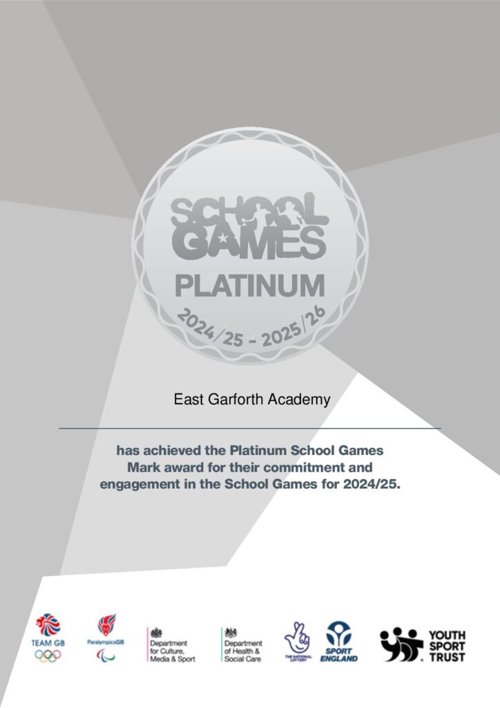 We are pleased to share that EGPA have achieved the School Games Platinum award for another year! A huge thank you must go to Mrs Armitage, Mrs Brownbill, Mr Wales and to all staff for supporting the clubs, events and competitions throughout the year for the pupils.